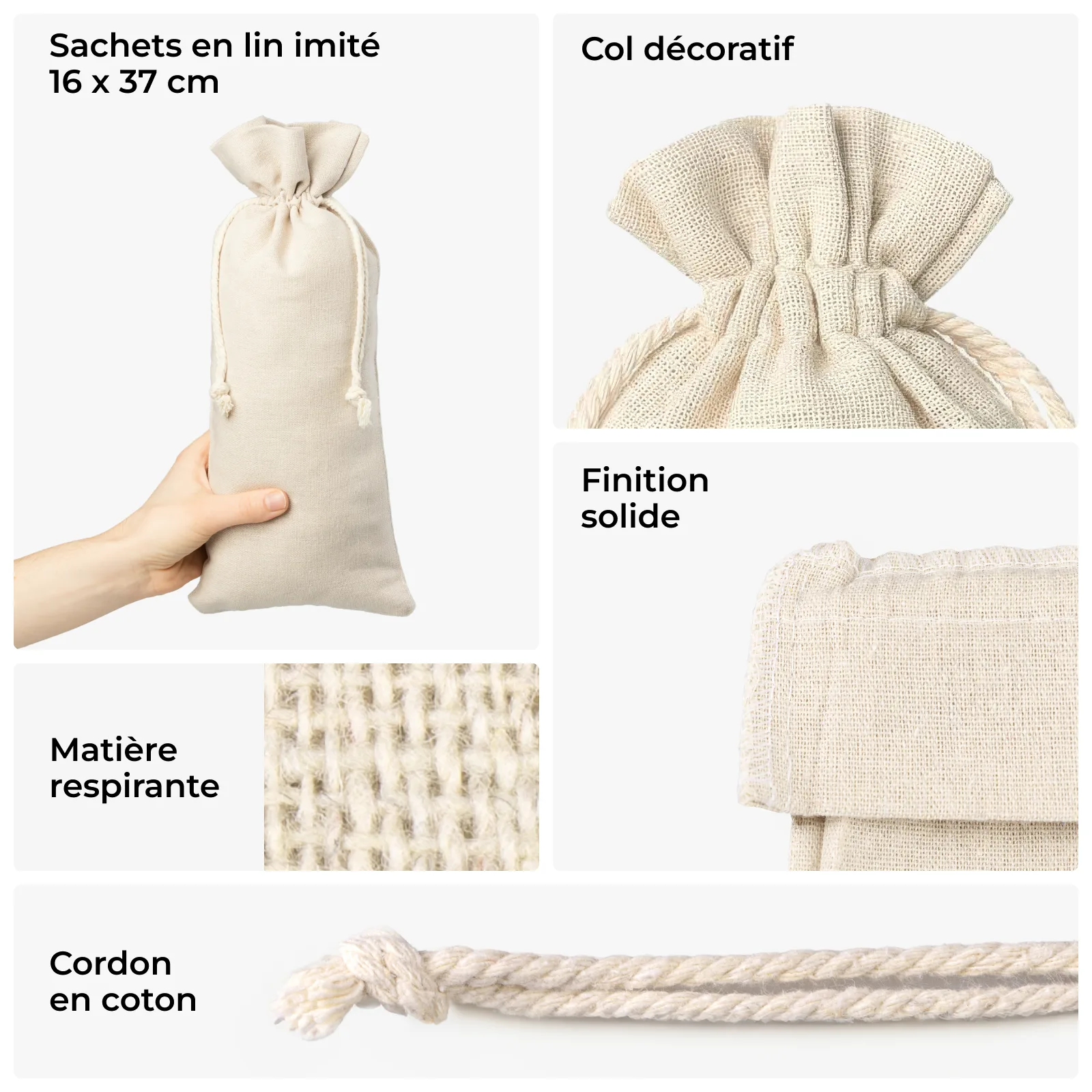 Versatilité d'utilisation : Nos sacs en lin sont parfaits pour les cadeaux d'entreprise, les emballages de produits, les échantillons et de nombreuses autres utilisations. Ils peuvent être utilisés dans divers secteurs, de la cosmétique à l'alimentaire.
