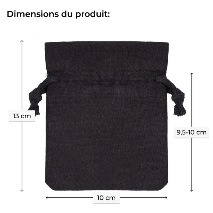 Le coton est un matériau classique, naturel et durable utilisé pour fabriquer des vêtements et accessoires. Il est facile à teindre et disponible dans diverses couleurs, y compris le noir. Nos sachets en coton noir de taille 10 x 13 cm sont élégants et viennent en ensemble de 10 pièces, parfaits pour emballer des cadeaux ou organiser des sacs.