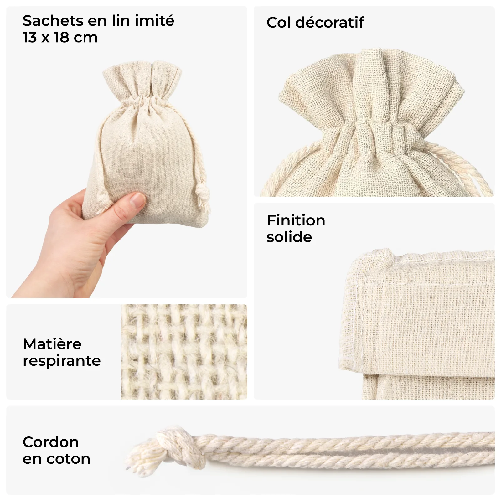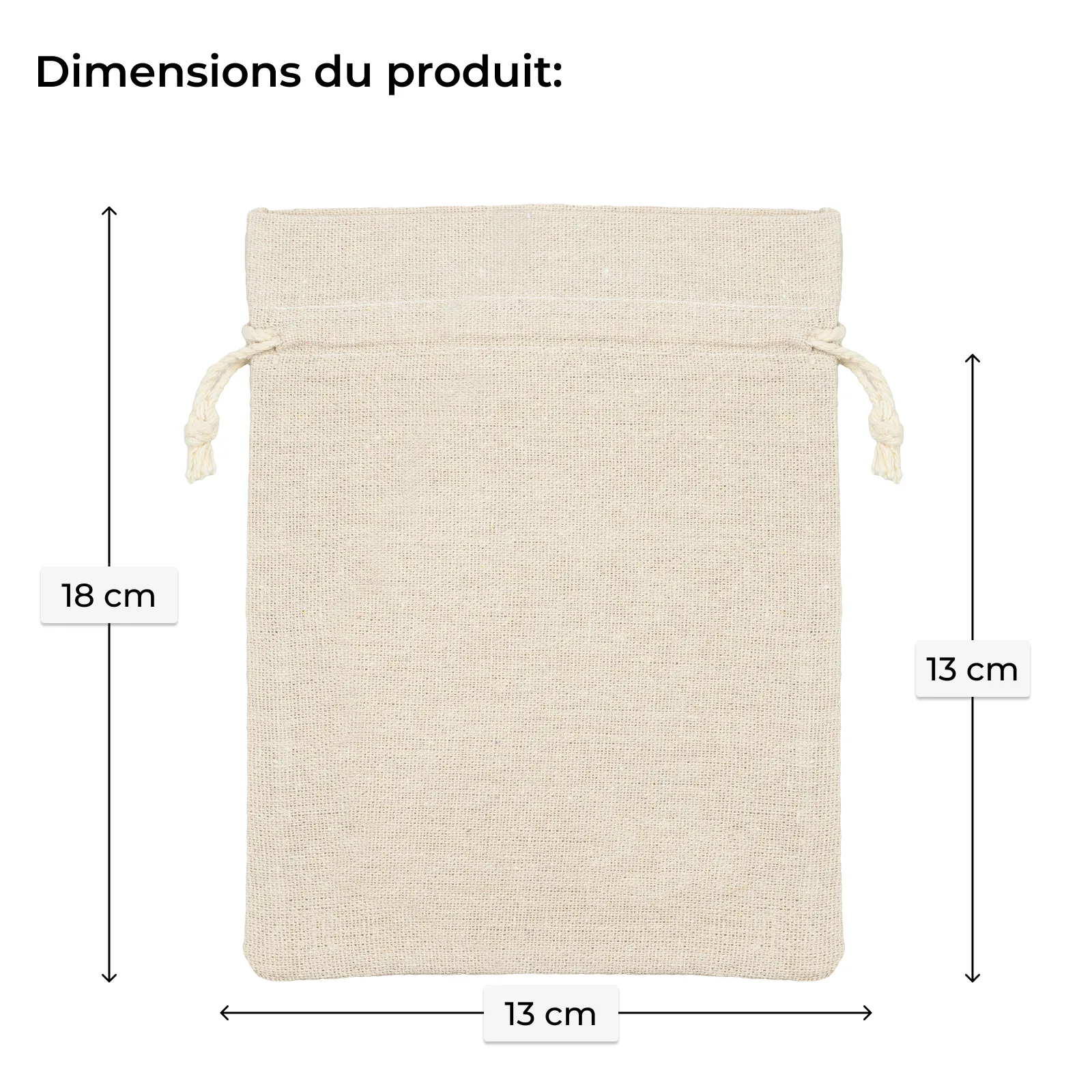 Découvrez les pochettes en tissu résistants et pratiques couleur lin naturel. Les pochettes présentées dans cette offre ont la taille de 13 x 18 cm. L'emballage comprend un set de 10 pièces de sachets universels.