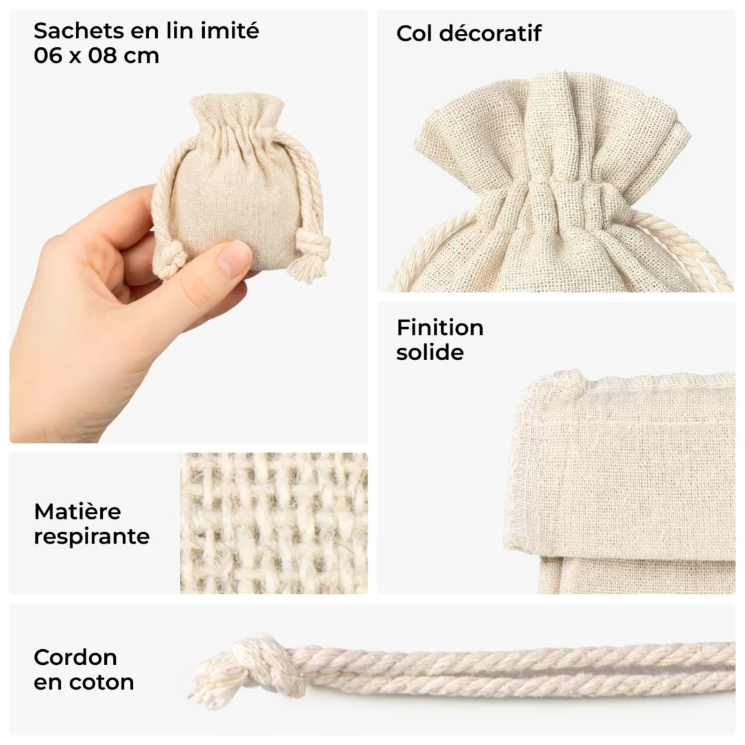Découvrez les sacs en tissu résistants et pratiques couleur lin naturel. Les pochettes présentées dans cette offre ont la taille de 6 x 8 cm. L'emballage comprend un set de 10 pièces de sachets universels.