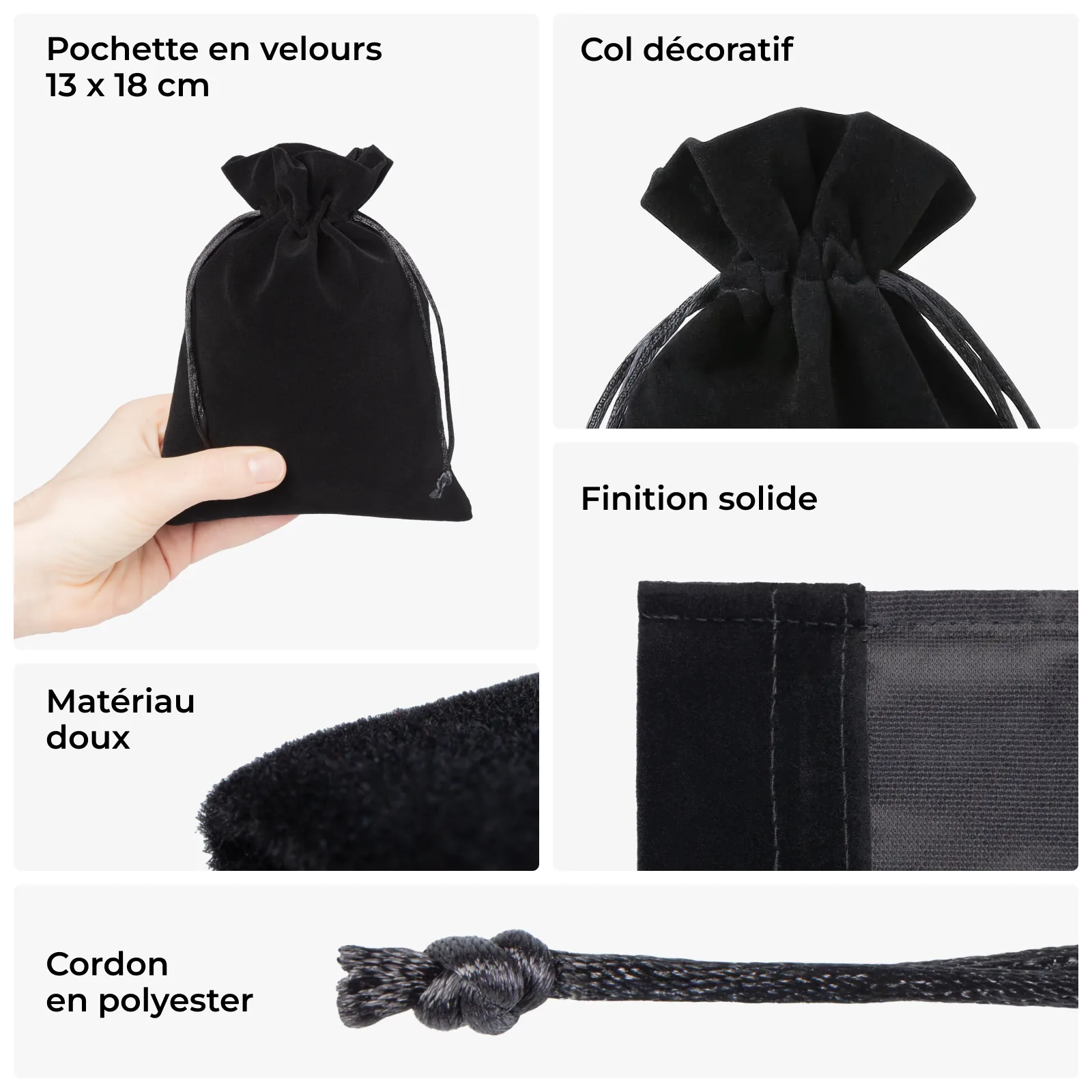 Nous proposons des pochons en velours élégants et fonctionnels de taille 13 x 18 cm, disponibles en pack de 10 pièces. Ces emballages de haute qualité sont la solution idéale pour les entreprises à la recherche de solutions stylées et pratiques. Nos pochons en velours sont une manière innovante d'emballer des cadeaux de manière exclusive ou de stocker des bijoux et d'autres objets personnels auxquels nous attribuons une grande valeur.