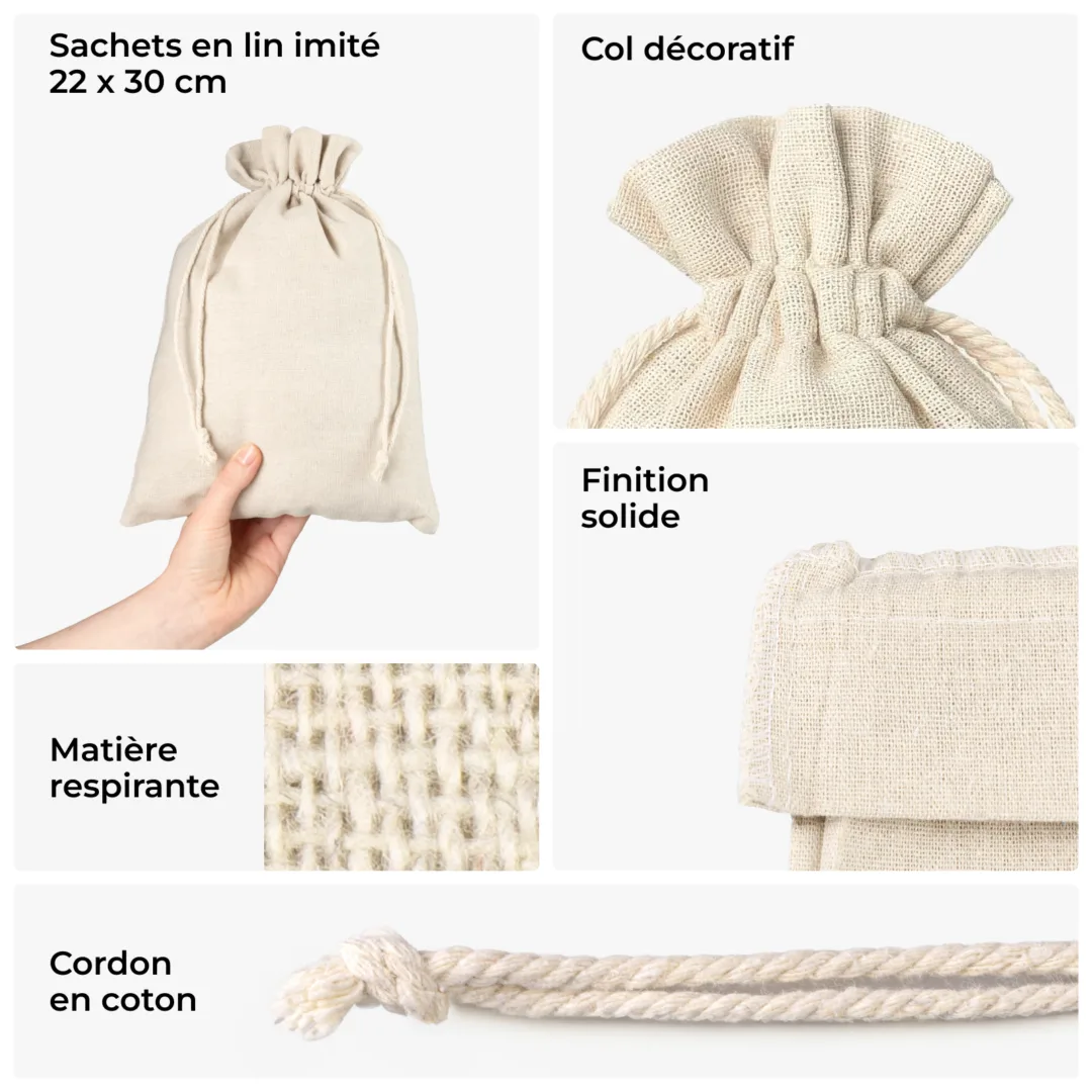 Ces pochettes ont été cousues de tissu en coton avec l'addition des fibres synthétiques, agréables au toucher et aérées. Ce tissu est très élégant - il reproduit la texture et la couleur du lin naturel. Son extraordinaire durabilité et sa haute résistance à l'abrasion et aux plis constituent un grand avantage. Ces emballages réutilisables sont un choix parfait !