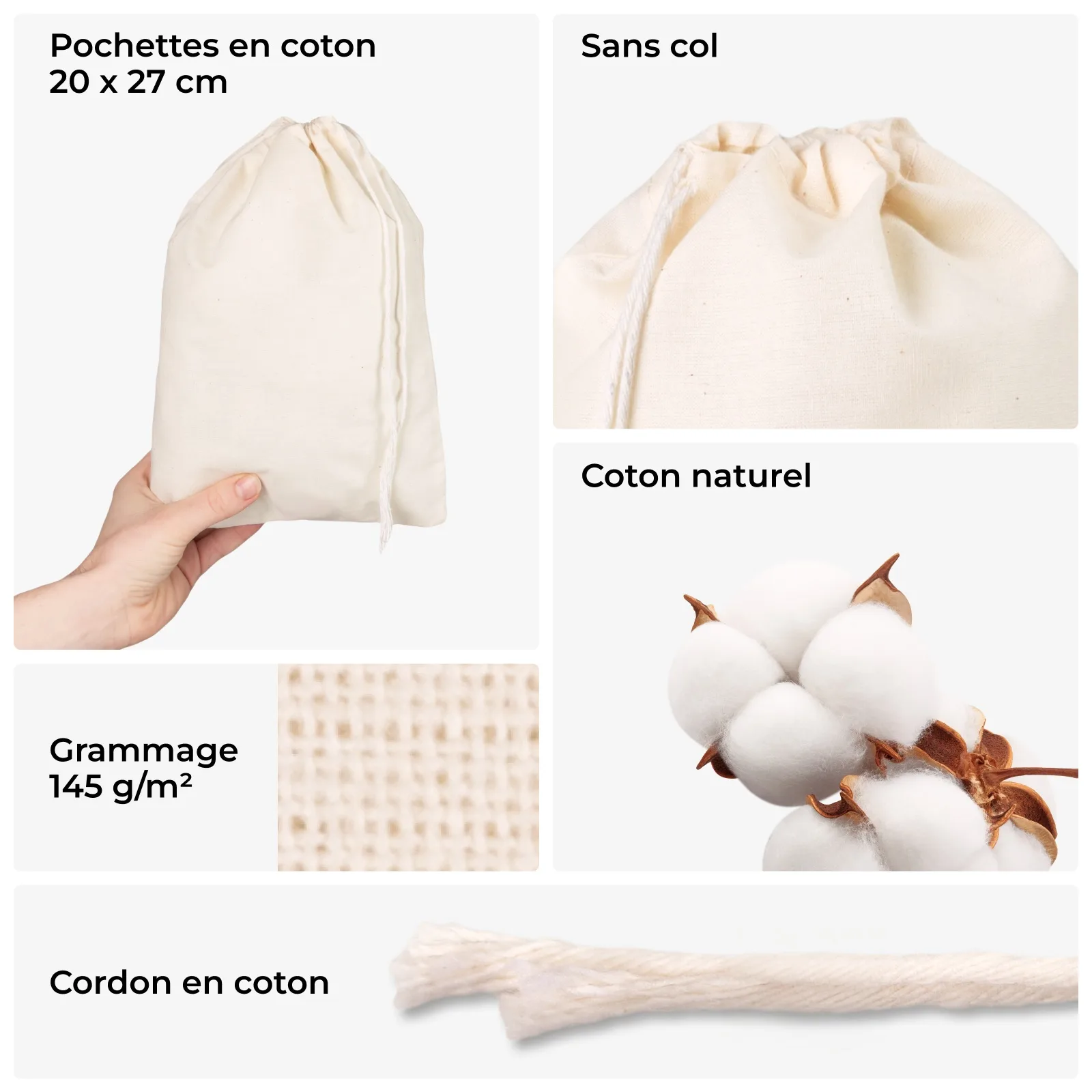 5 pcs Pochettes en coton 20x27 cm avec un cordon simple - naturel, pour cadeaux