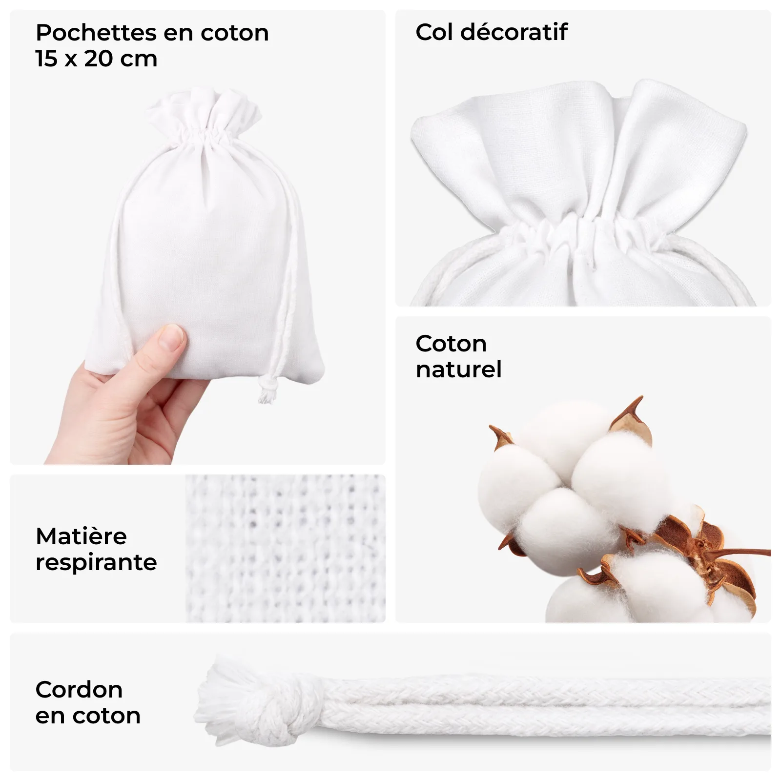 Nos sachets sont confectionnés en coton de haute qualité – durable, résistant et avec un aspect naturel et soigné.