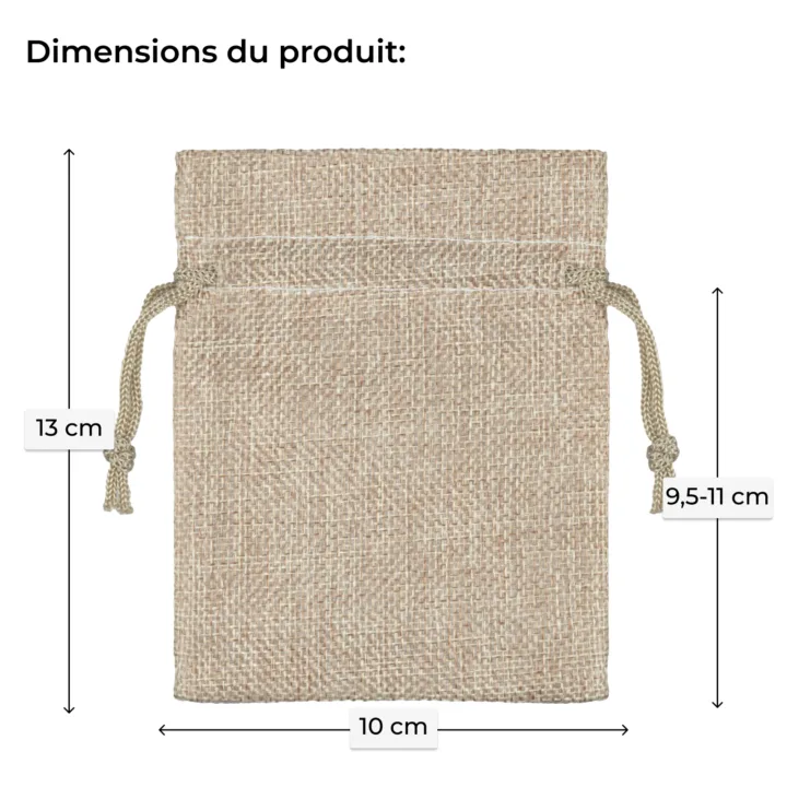 Petites pochettes en toile de jute disponibles en naturel, dimensions : 10 cm x 13 cm. Le paquet se compose de 10 pièces, de sorte que l'achat peut suffire pour une longue période. Les sacs en jute de notre gamme sont fabriqués à partir de matériaux naturels ou synthétiques et indépendamment du type de tissu, nos pochettes sont robustes, solides, ont un design unique et ressemblent à une ficelle tressée.