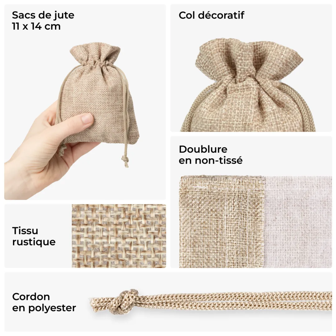 Petites pochettes en toile de jute disponibles en naturelle, dimensions: 11 cm x 14 cm. Le paquet se compose de 10 pièces, de sorte que l'achat peut suffire pour une longue période. Les sacs en jute de notre gamme sont fabriqués à partir du matériel naturel ou synthétique et indépendamment du type de tissu, nos pochettes sont robustes, solides, ont un design unique et ressemblent à une ficelle tressée. Le jute a une bonne capacité d'absorption, augmente l'humidité de l'air et cela fait que, par conséquent, les conditions changeantes tout autour ne posent pas de problème. Les pochettes en jute de notre offre fournissent un large choix, car nos modèles sont disponibles dans plusieurs couleurs. Une vaste gamme garantit la satisfaction et fait qu'il y en a pour satisfaire tous les goûts.
