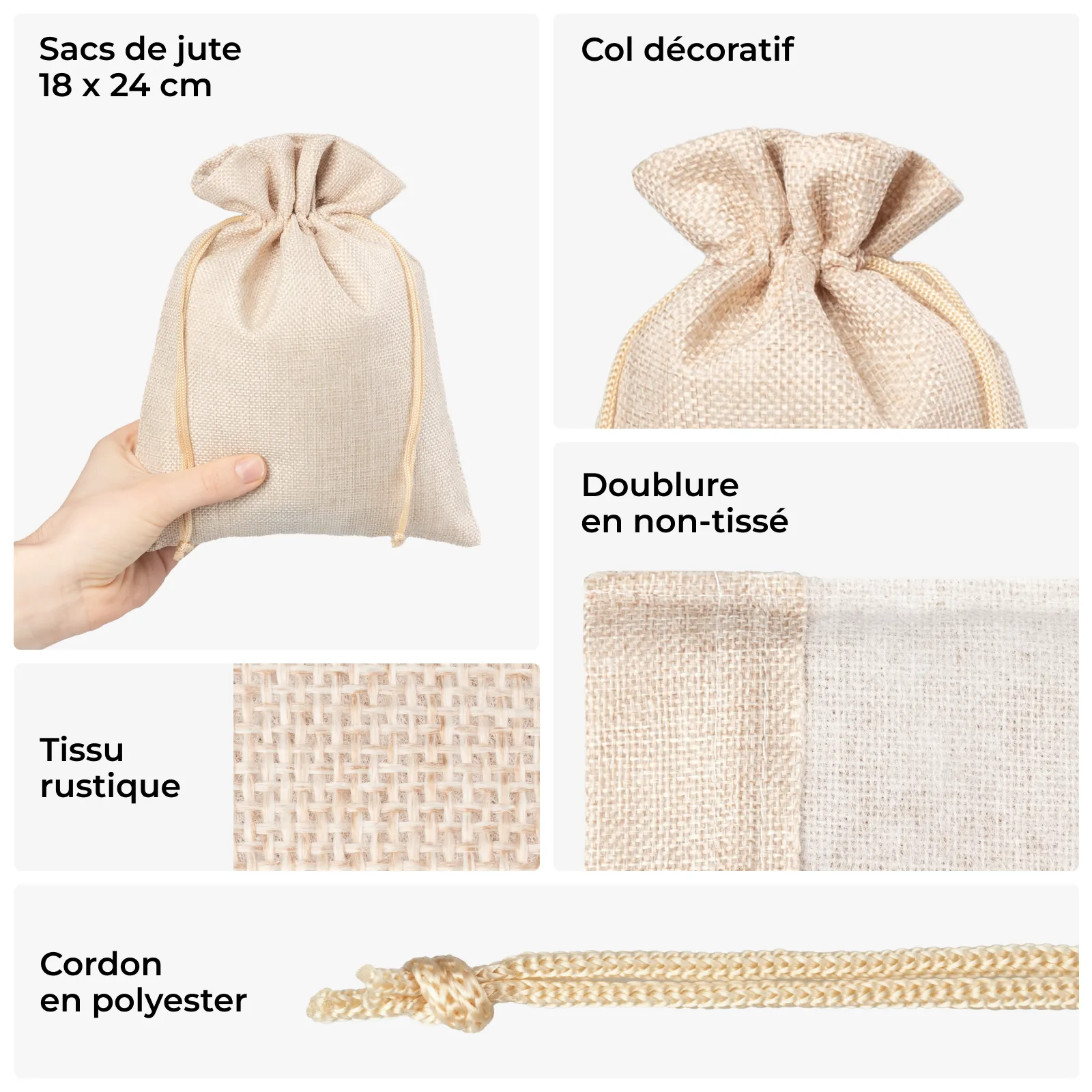 Notre offre présente des sacs de jute naturel et synthétique, peu importe l'origine, vous serez séduit par le look 'rustique' compatible aux paysages, fragrances naturelles, l'alimentation bio et autres produits biologiques. En bref, le jute est idéal pour les événements au climat rural.