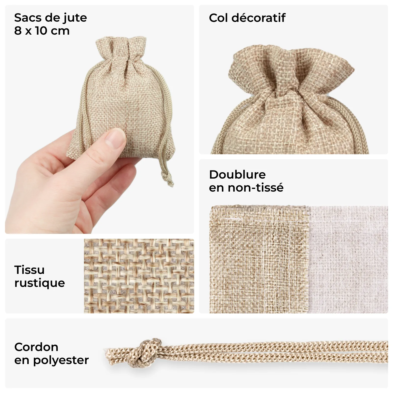 À la recherche d'emballages pour de petits cadeaux pour les invités de mariage ? Nous vous recommandons les petits sachets en jute de couleur naturelle, qui ont une allure élégante et sont réutilisables. Sur un tel sac, nous pouvons imprimer la date du mariage et vos noms - optez pour l'option de personnalisation. Les sachets en jute de 8 x 10 cm conviennent également parfaitement à d'autres occasions : choisissez cette taille si vous souhaitez un cadeau symbolique tel que des bonbons, une figurine, une bougie ou un savon artisanal.