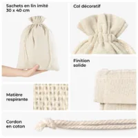 Le large éventail de tailles et une certaine flexibilité permettent d’y ranger de nombreux articles aux fonctions, propriétés ou formes différentes. Les petits sacs en lin sont idéaux pour ranger de petits objets tels que des bijoux. Nous proposons également des sacs en lin plus grands, mesurant 16 x 37 cm, qui vous permettront d’emballer des écocosmétiques ou d’autres articles et d’accueillir parfaitement une bouteille de vin. Les sacs à la linen dotés d’un œillet, idéaux pour être accrochés à la poignée d’une porte d’hôtel, sont particulièrement remarquables.