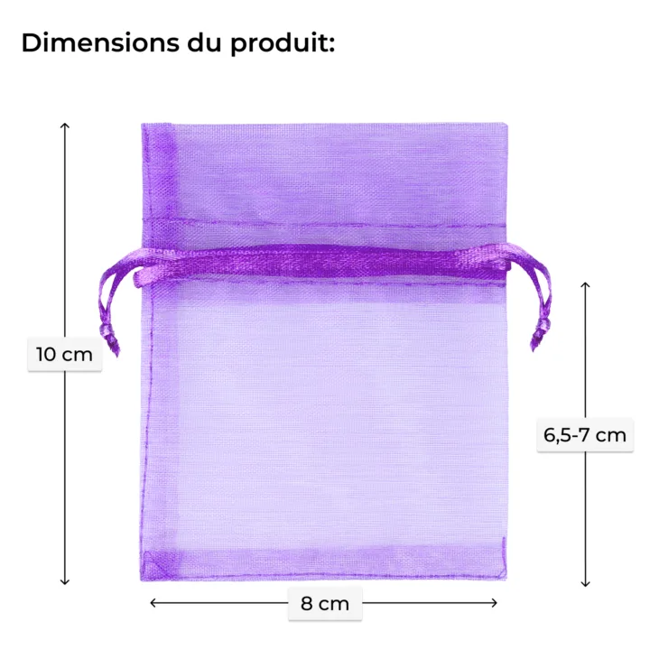 Les sacs en organza de 8 x 10 cm disponibles en violet sont un produit qui combine durabilité et élégance. Grâce à la haute qualité du matériau, nos sacs sont durables et résistants aux dommages, garantissant une utilisation à long terme. Ils sont idéaux pour l'emballage de cadeaux, le stockage de bijoux ou de cosmétiques, ainsi que pour les décorations de mariage et autres célébrations.