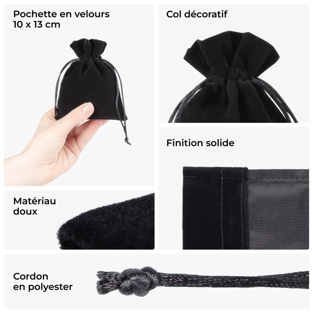 Nous Vous présentons un ensemble extraordinaire des sachets en velours composé des 10 pièces. Ils sont disponibles en couleur noir et de dimensions 10 x 13 cm. Cet ensemble unique est universel et grâce à sa grande quantité, il durera longtemps.