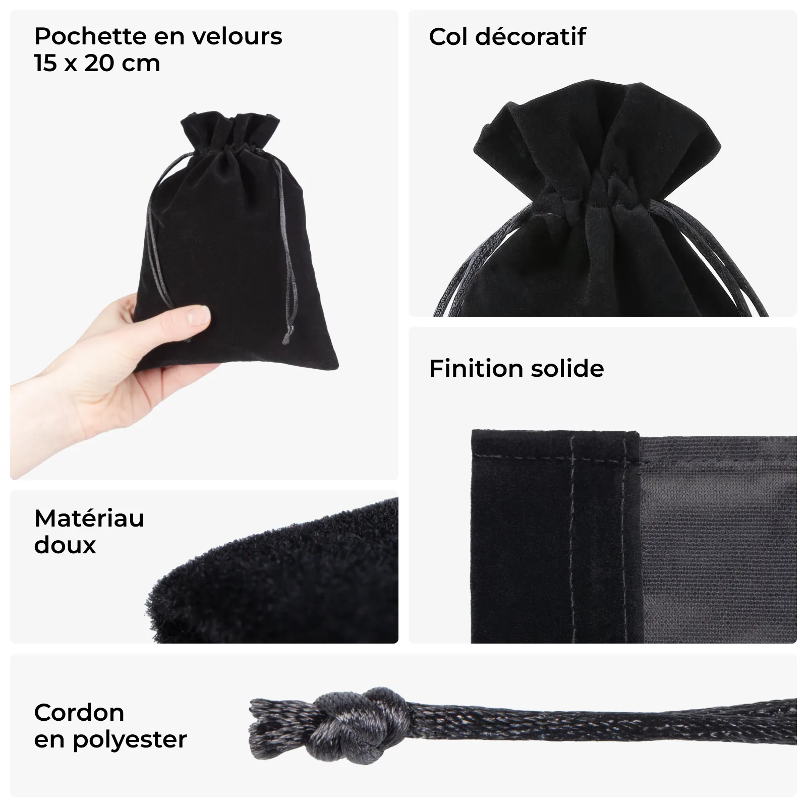 L'ensemble comprend 5 pièces de sacs en velours noirs de taille 15 x 20 cm. Vous recherchez une couleur ou une taille différente ? Découvrez toute la collection de pochettes en velours disponibles dans notre magasin !