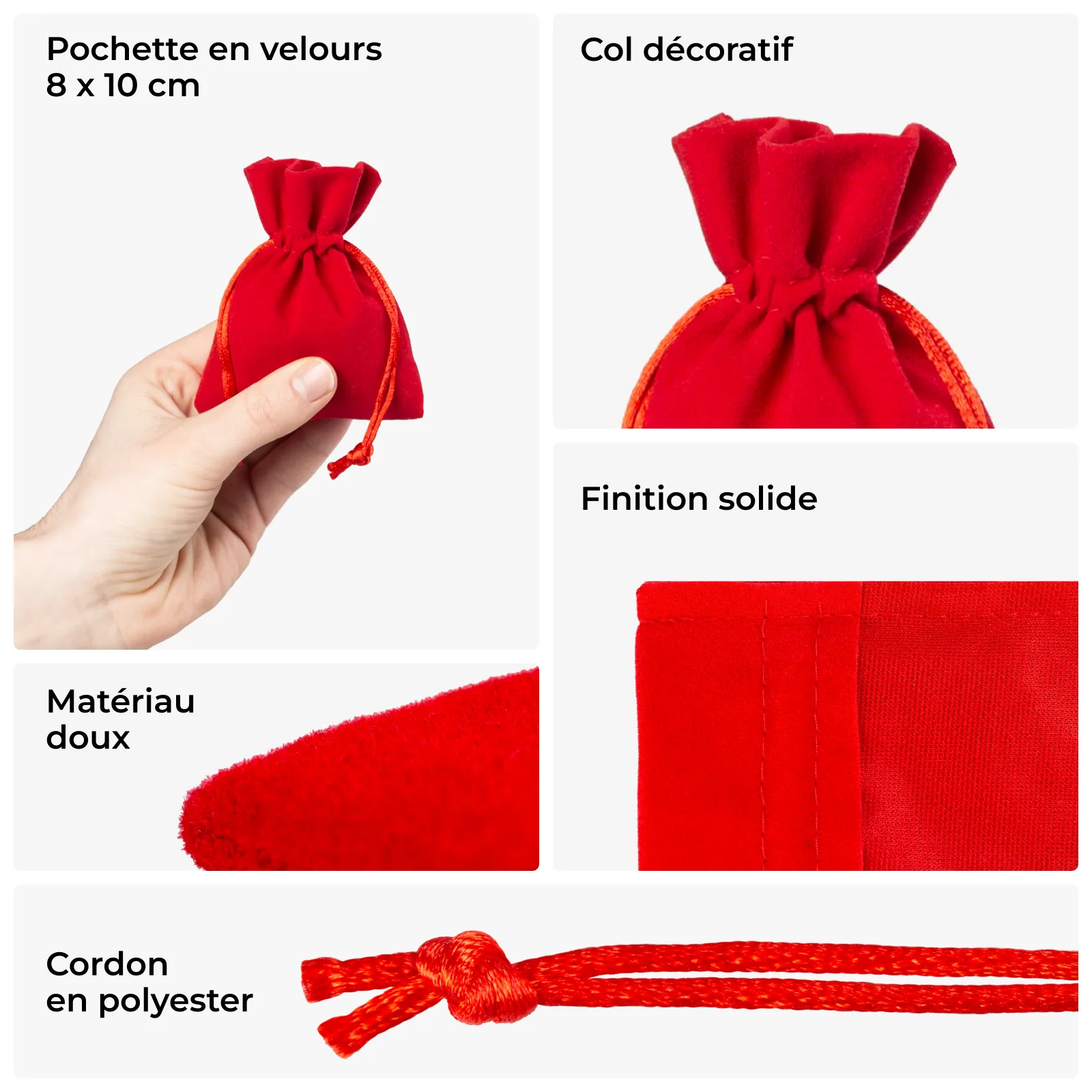 Nos sacs en velours rouge de taille 8x10 cm sont un excellent choix pour les entreprises à la recherche d'emballages élégants et fonctionnels. Fabriqués en velours de haute qualité, ils sont non seulement esthétiques, mais aussi très pratiques.